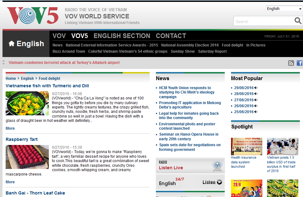 B: If you think you want to try Vietnamese dishes one day, go to the Food Delight segment on VOV’s website www.vovworld.vn to get a recipe. Thank you for your feedback as well as your technical notes of VOV’s transmission in your place. We’re glad to know that the reception quality was very good for the 1600 UTC and 1900 UTC broadcasts. The 9730 kHz from 1900 UTC is often troubled by strong interference from China Radio International but the 7280 kHz is well heard at the same time.
