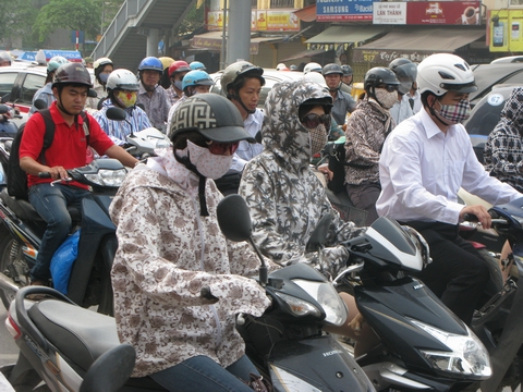 | Motorbike drivers wear sun-proof clothes to protect themselves from baking sunshine |