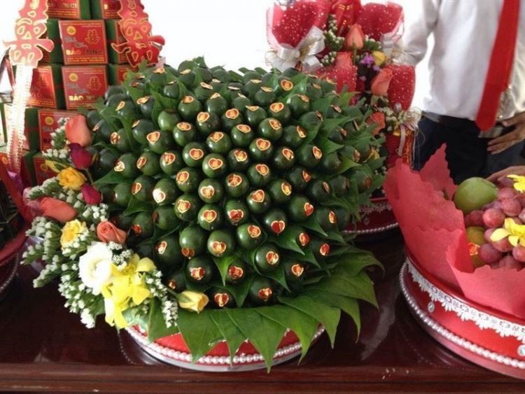 A: Since then, at proposals and wedding ceremonies, the groom’s wedding gifts for the bride must always have areca nuts and betel leaves, along with other kinds of fruit, young-sticky-rice cakes, tea, and wine.