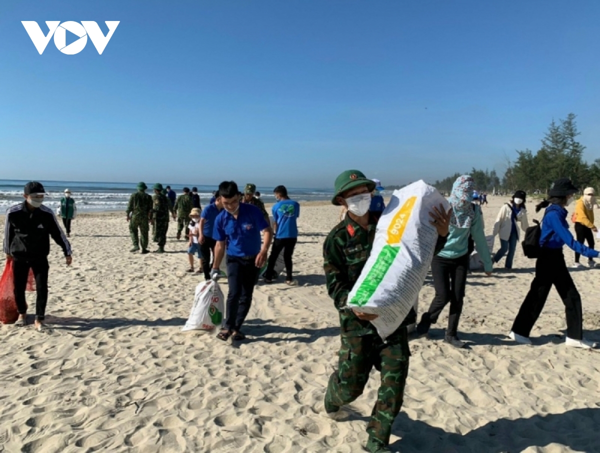 People collect waste on the beach in Quang Ngai province. (photo: VOV) |