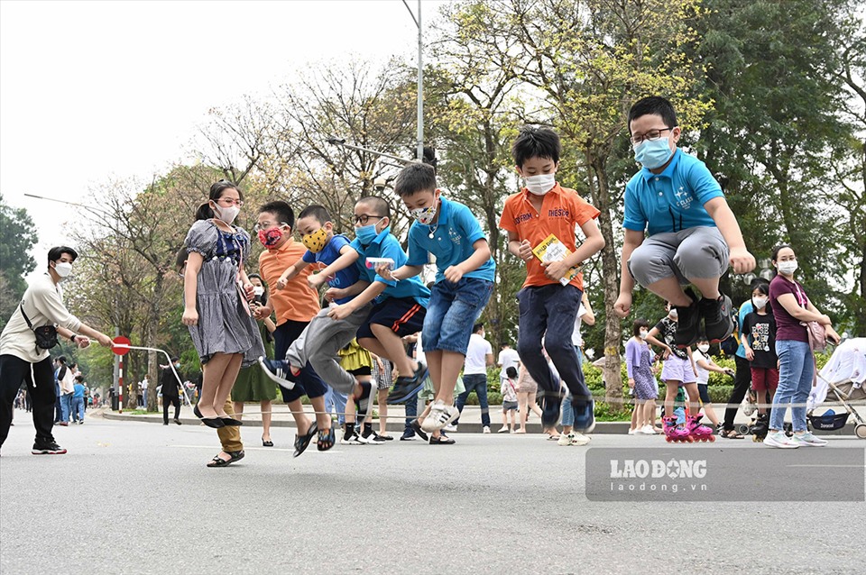 Children jump robe at pedestrian space around Hoan Kiem Lake. |