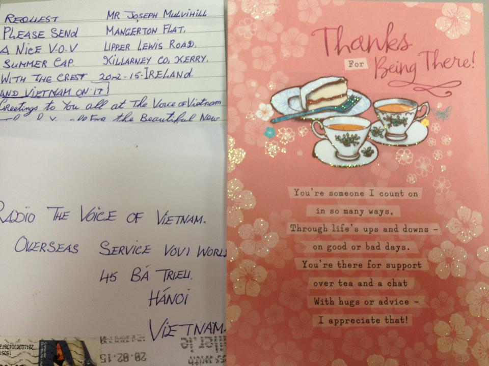 A: Sending us a beautiful postcard with warm greetings, Joseph Mulvihill of Ireland wrote: “Greetings to you all at the Voice of Vietnam. Thank you all for the beautiful New Year card, pocket calendar 2015, and program guide. First of all, may I wish you all at VOV a very happy New Year 2015. I have no internet. I have a shortwave radio. Could you send me a radio report form so I can report my reception to VOV?”