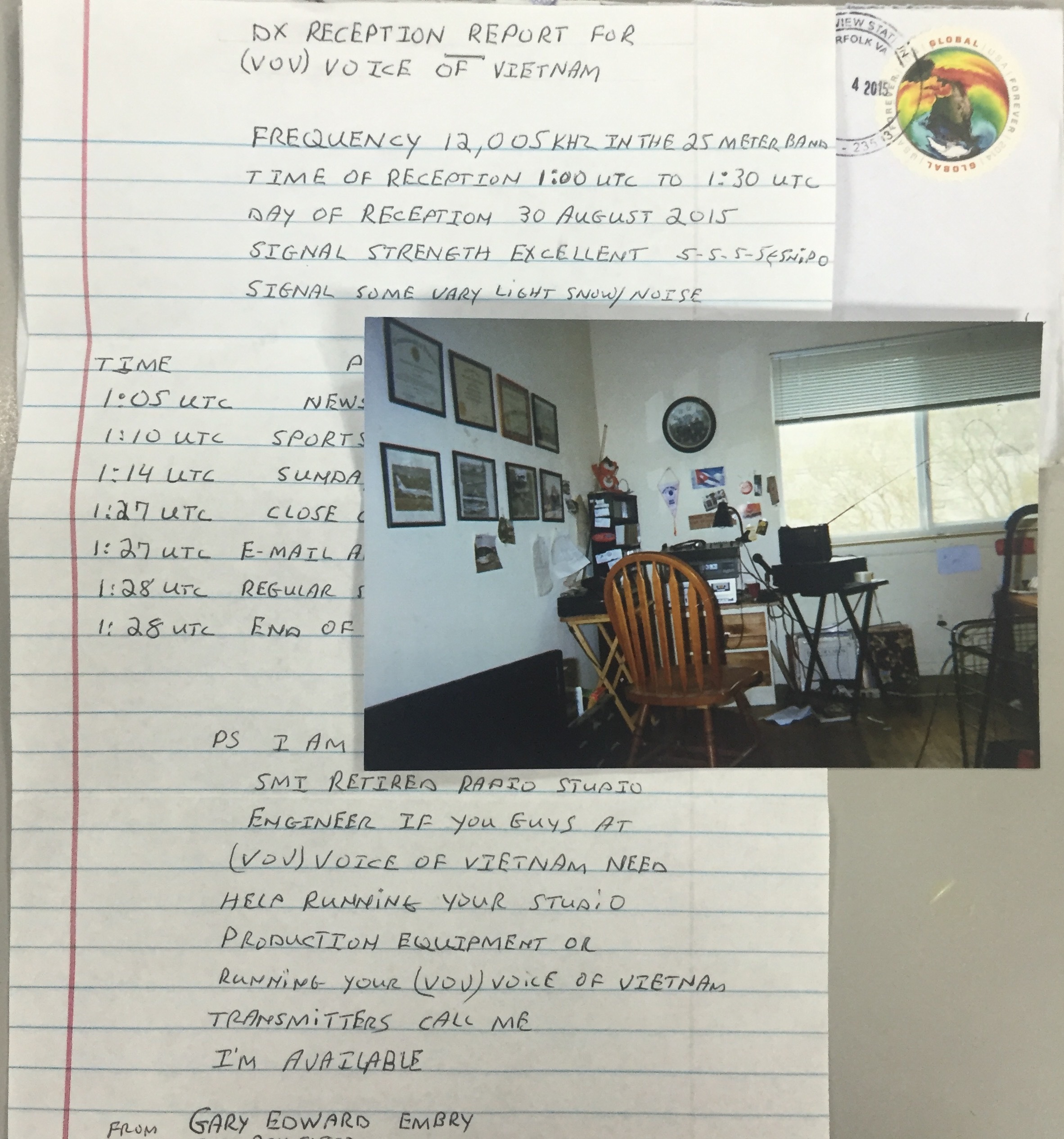 B: I’m reading a letter from American listener Gary Edward, who sent us a reception report for the program on August 30, 2015. He said the signal was excellent with SINPO rating all 5s. Gary is a 72-year-old retired radio studio engineer. He says if VOV needs help running studio equipment or transmitters, call him and he’s available.