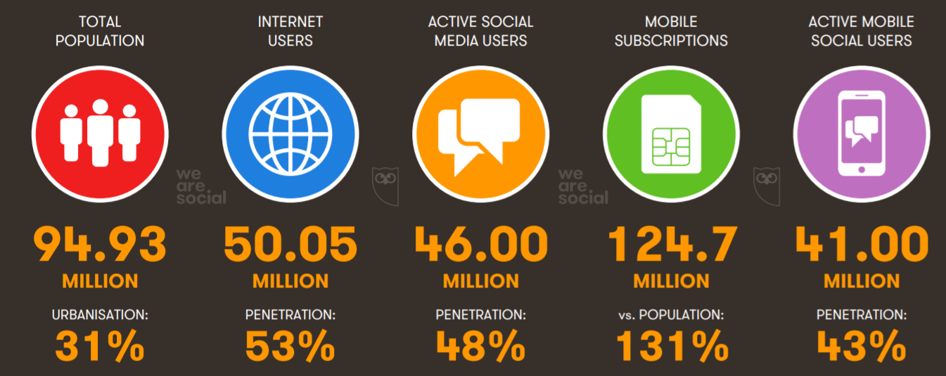 B: According to the Ministry of Information and Communications, Vietnam has 50 million Internet users, 54% of the population, higher than the global average of 46%. Over the past 2 decades, Vietnam has witnessed significant growth in internet-based services and products.