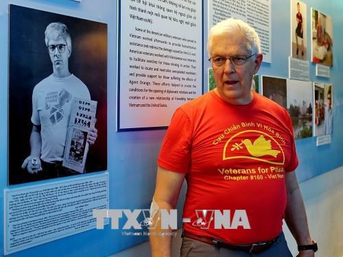 At the War Remnants Museum, Veteran Paul Cox stands next to his own picture taken when he took part in a campaign supporting peace for Vietnam. He fought in Vietnam in 1969-1970. (Photo: VNA) |