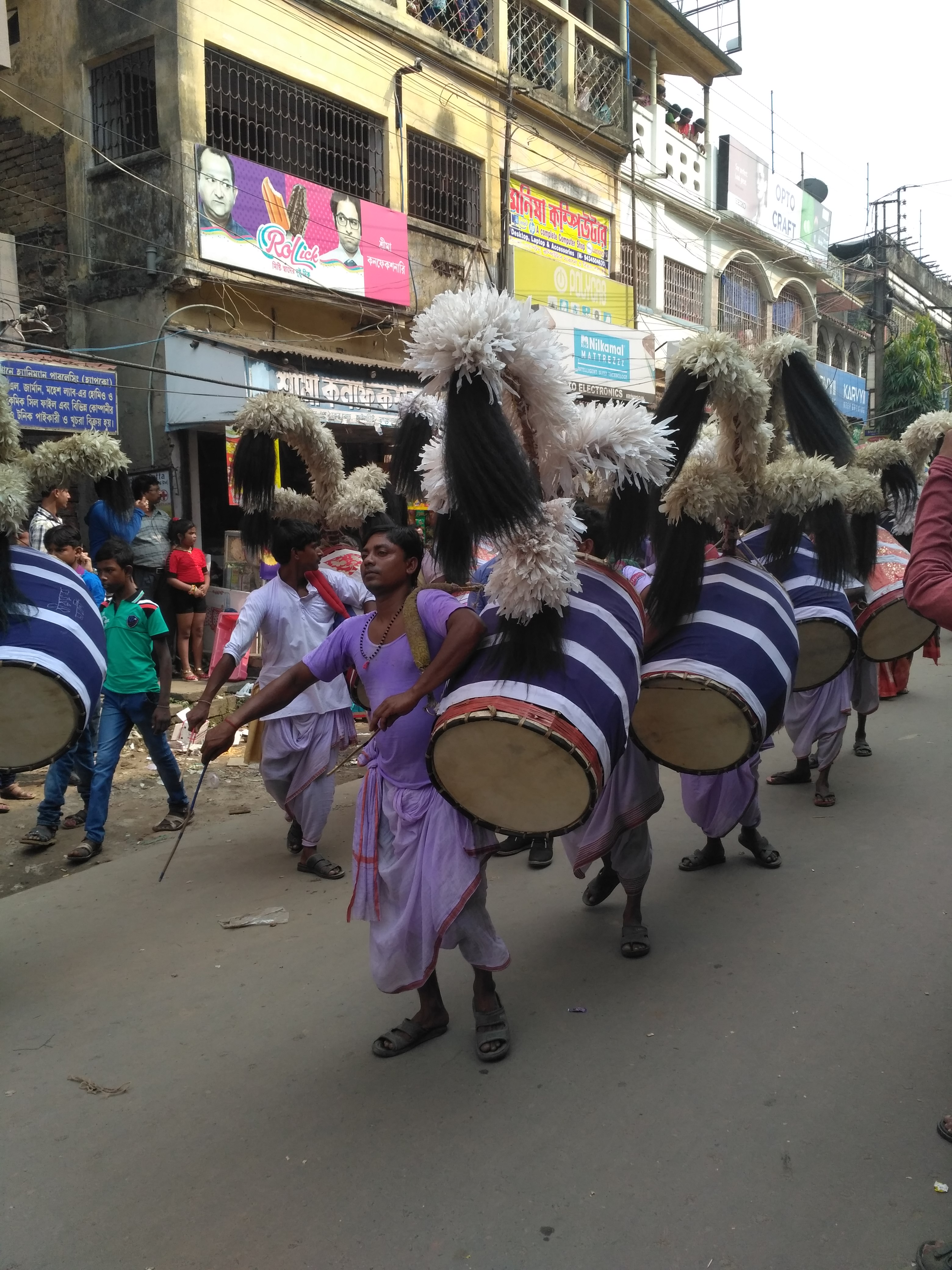 B: Kanchan KR Chatterjee of India sent us some photos of a Hindu festival. Thank you for letting me know about an annual Hindu event that reveres the Goddess Durga. The festival is observed in the Hindu calendar month of Ashvin, typically September or October, and is a multi-day festival that features elaborate temple and stage decorations, scripture recitation, performance arts, revelry, and processions.