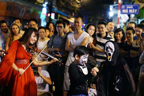 B: Carved pumpkins and black-and-orange decorations are becoming increasingly popular in Vietnam, especially in the cities. Parties are held in tourists areas like Hanoi’s Old Quarters, usually in cafes, bars and restaurants frequented by foreigners. In Ho Chi Minh City, late last month, De Tham and Bui Vien, two famous tourists streets, are packed with locals and foreigners. It’s an amazing cultural intersection of East and West.