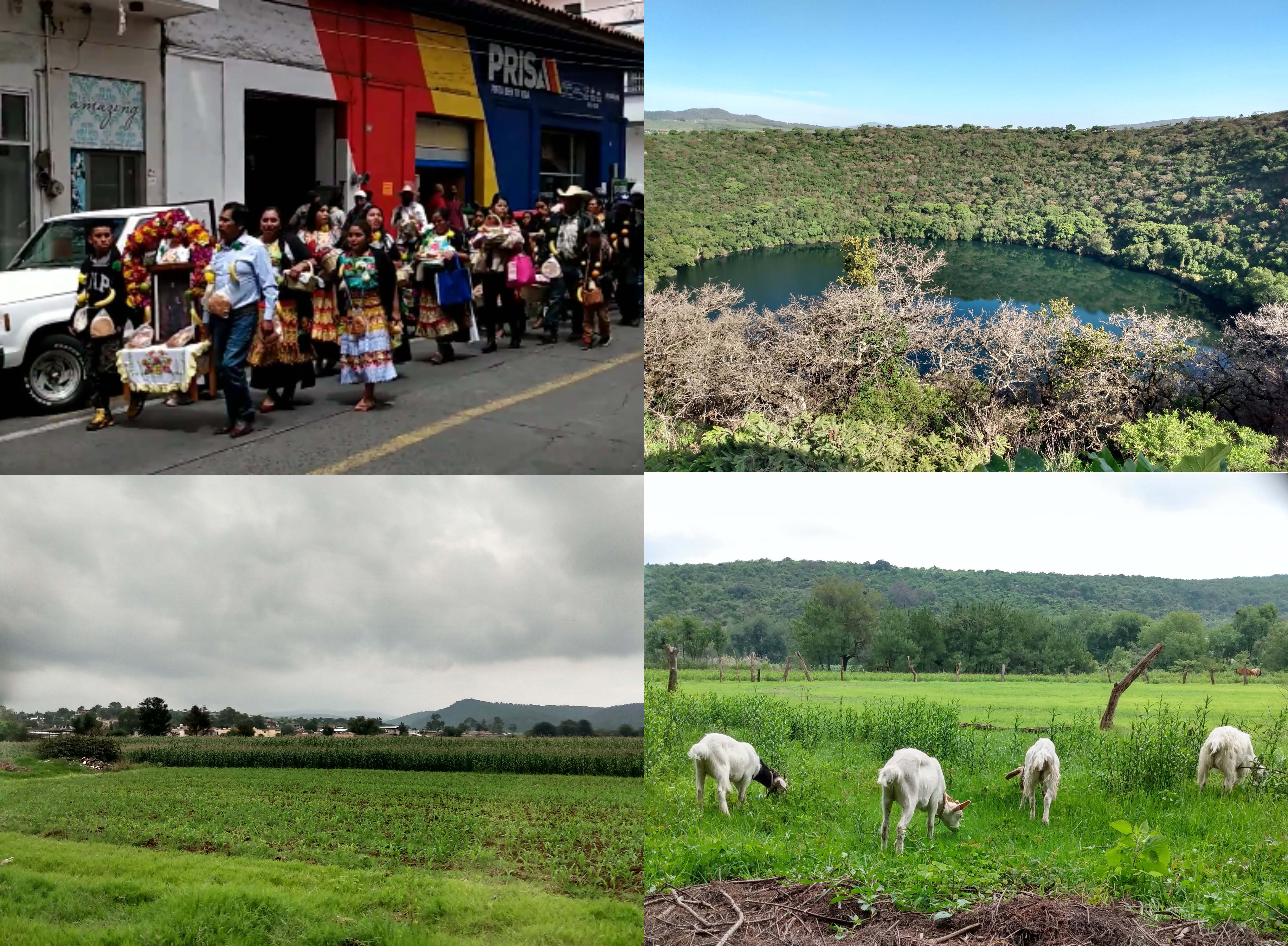 Geovani Vázquez Reynoso sent us the photos: "The first photo is of a typical celebration of martyrs in the urbanized streets of Zacapu, traditional Purépecha clothes are worn for this special occasion. Next to it is a panoramic view of "Los Espinos", avolcanic crater lake. The last two photos are of rural areas where they grow sorghum, lentils, chickpeas, alfalfa, and many varieties of maize." |