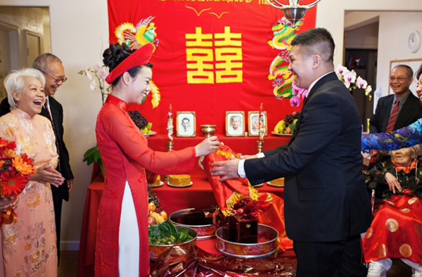 A: Women in the ceremony all dress in Ao Dai and men dress in western suits or the traditional men’s Ao Dai. The delegation is usually led by the couple that is wealthiest and most successful in the family to bring the couple luck and success in their future life together. The groom's family stops in front of the bride's house and waits for the lead couple to enter the house first with a tray of wine. They invite the bride's parents to take a sip. By accepting the toast, the bride's family agrees to allow the groom’s family to enter their house.