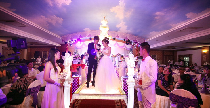 A: After the wedding ritual, there is a party for all the relatives and friends at one of the houses, if it’s large enough, or at a restaurant. The bride often changes into a white western-style gown for the party. The couple performs a cake-cutting ritual and drink toasts with all the guests as the party begins.