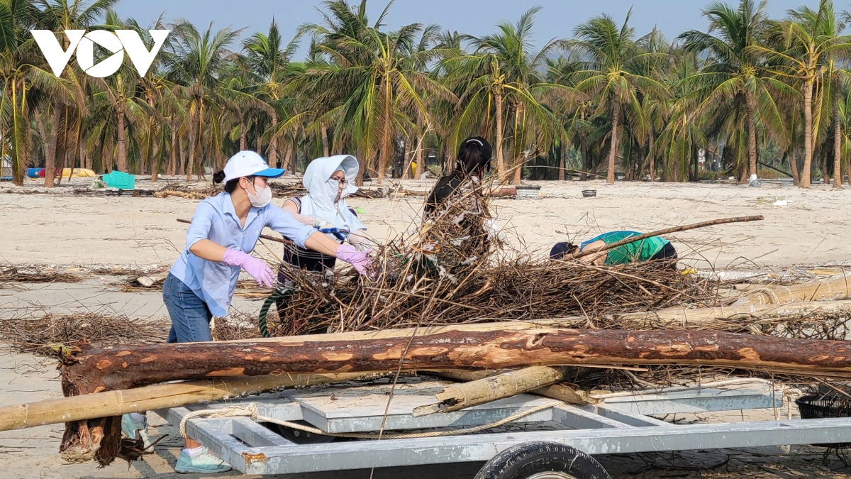 People in Quang Ninh province clean the beach after typhoon Yagi. |