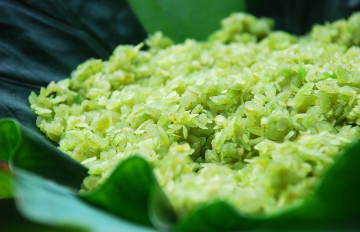 A: Vong and Me Tri are the two Hanoi villages famous for making green sticky rice. Green sticky rice can be made from several different types of paddy, but the most delicious is made from yellow flowery paddies.