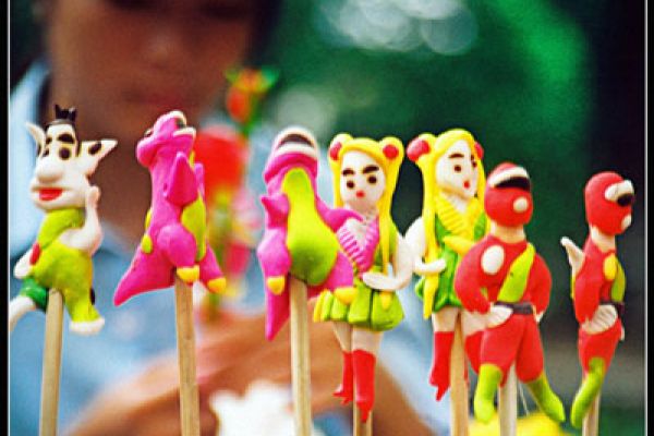 B: ‘To he’ are colorful miniature figurines made from glutinous rice powder. In the past, tò he were sold only on the occasion of festivals popular with children like Tet (the Lunar New Year Festival) and the Mid-Autumn Festival. Today to he can be found at most festivals in Vietnam, and throughout the year in public parks and gardens, thanks to efforts by artisans and cultural researchers to preserve the craft.