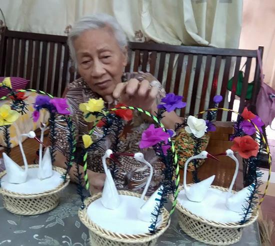 B: There is only one family in Hanoi still making stuffed swan toys for sale. The toy includes a basket in which two small spotless white stuffed swans with cute red beaks nestle among colorful flowers.