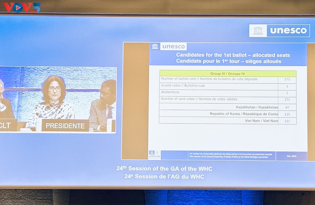 ດ້ວຍຈຳນວນບັດເຫັນດີ 121 ບັດ, ນີ້ແມ່ນຄັ້ງທີ 2 ທີ່ ຫວຽດນາມ ສືບຕໍ່ໄດ້ຮັບການເລືອກຕັ້ງເປັນສະມາຊິກ ຄະນະກຳມະການມໍລະດົກໂລກ (ພາບ: VOV) |