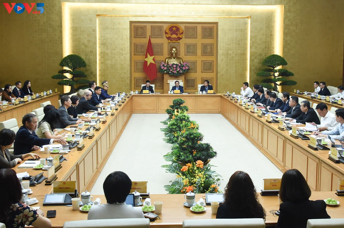 ຕອນເຊົ້າວັນທີ 13 ພຶດສະພາຢູ່ ຮ່າໂນ້ຍ ທ່ານນາຍົກລັດຖະມົນຕີ ຫວຽດນາມ ຟ້າມມິງຈິງ ໄດ້ເຮັດວຽກກັບຜູ້ຕາງໜ້າປະຊາຄົມວິສາຫະກິດ ອາເມລິກາ ທີ່ພວມລົງທຶນ, ດຳເນີນທຸລະກິດ ຢູ່ ຫວຽດນາມ. ນີ້ແມ່ນການພົບປະຄັ້ງທີ 2 ຂອງທ່ານນາຍົກລັດຖະມົນຕີ ຫວຽດນາມ ຟ້າມມິງຈິງ ກັບບັນດາວິສາຫະກິດ ອາເມລິກາ ໃນໄລຍະເວລາພຽງ 2 ເດືອນ, ເພື່ອພ້ອມກັນແກ້ໄຂຂໍ້ຄົງຄ້າງສ້າງເງື່ອນໄຂສະດວກທີ່ສຸດໃຫ້ປະຊາຄົມວິສາຫະກິດ ອາເມລິກາ ເຄື່ອນໄຫວຢູ່ ຫວຽດນາມ. ໃນການເຮັດວຽກ, ທ່ານນາຍົກລັດຖະມົນຕີຢັ້ງຢືນທັດສະນະຂອງ ຫວຽດນາມ ນັ້ນແມ່ນ ສ້າງທຸກເງື່ອນໄຂສະດວກ ແລະ ປົກປ້ອງສິດ, ຜົນປະໂຫຍດອັນຊອບທຳຂອງວິສາຫະກິດ, ໃນນັ້ນ ມີວິສາຫະກິດ ອາເມລິກາ ເພື່ອໃຫ້ວິສາຫະກິດຮ່ວມມື, ລົງທຶນ, ດຳເນີນທຸລະກິດແບບຍືນຍົງຢູ່ ຫວຽດນາມ: