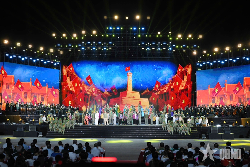ລາຍການສະແດງສິລະປະການເມືອງ “ພາຍໃຕ້ຄັນທຸງອັນສະຫງ່າ” ໄດ້ວາດພພາບເຖິງບັນຍາກາດປະຫວັດສາດທີ່ສັກກະລະບູຊາ, ສະຫງ່າອົງອາດຂອງບັນດາຂີດໝາຍປະຫວັດສາດ: ການປະຕິວັດເດືອນສິງຫາ, ວັນປະກາດເອກະລາດທີ 2 ກັນຍາ 1945, ບັນຍາກາດອັນຟົດເດືອດຂອງ ຮ່າໂນ້ຍ ໃນຕະຫຼອດ 60 ວັນ ແລະ ຄືນ ຕໍ່ຕ້ານລ່າ ເມືອງຂຶ້ນ ຝລັ່ງ; ວັນຍາດໄດ້ສິດປົກຄອງ ນະຄອນຫຼວງ... ແລະ ບັນດາເລື່ອງລາວຂອງນັກຮົບທີ່ພ້ອມແລ້ວເສຍສະຫຼະເລືອດເນື້ອຂອງຕົນເພື່ອປະກອບສ່ວນສ້າງໜ້າປະຫວັດສາດ, ຜູ້ເປັນແມ່, ເປັນເມຍ ທີ່ລໍຄອຍຜູ້ເປັນຜົວ, ຜູ້ເປັນລູກອອກສະໜາມຮົບໂດຍບໍ່ມີວັນກັບຄືນ...