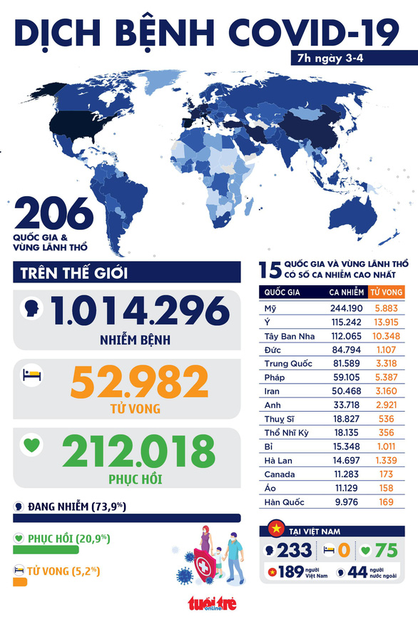 ອາເມລິກາ ພວມແມ່ນຈຸດໃຈກາງຂອງໂລກລະບາດດ້ວຍຜູ້ຕິດໂລກລະບາດແມ່ນ 224.433 ຄົນ ແລະ 6.063 ຄົນເສຍຊີວິດ. ຖັດຈາກນັ້ນແມ່ນ ອີຕາລີ ມີຜູູ້ຕິດໂລກລະບາດແມ່ນ 115.242 ຄົນ ແລະ ແອັດສະປາຍ ແມ່ນ 112.065 ຄົນ.