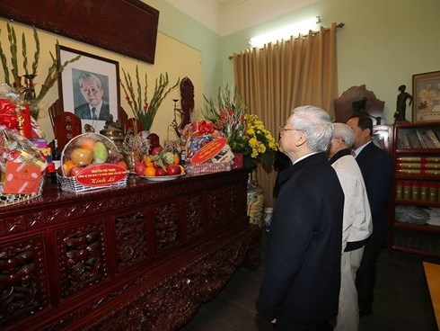ຕອນເຊົ້າວັນທີ 14 ກຸມພາ, ທ່ານເລຂາທິການໃຫຍ່ຄະນະບໍລິຫານງານສູນກາງພັກກອມມູນິດ ຫວຽດນາມ ຫງວຽນຟູຈ້ອງ ໄດ້ຖະຫວາຍທູບທຽນອາໄລຫາເລຂາທິການໃຫຍ່ ເລຢວນ, ເລຂາທິການໃຫຍ່ ເຈືອງຈິງ. ທ່ານເລຂາທິການໃຫຍ່ ຫງວຽນຟູຈ້ອງ ໄດ້ຫວນຄືນບັນດາຄຸນງາມຄວາມດີ, ການປະກອບສ່ວນອັນໃຫຍ່ຫລວງຂອງເລຂາທິການໃຫຍ່ ເລຢວນ, ເລຂາທິການໃຫຍ່ ເຈືອງຈິງ ໃນພາລະກິດການປະຕິວັດຂອງພັກ, ຂອງປະເທດຊາດ; ສະແດງຄວາມຮູ້ບຸນຄຸນຢ່າງເລິກເຊິ່ງຕໍ່ຄົນລຸ້ນກ່ອນ, ບັນດາຜູ້ທີ່ປະກອບກຳລັງເຫື່ອແຮງເພື່ອສ້າງສາປະເທດຊາດຄືປັດຈຸບັນ. ໃນບັນຍາກາດທີ່ອົບອຸ່ນຂອງວັນບຸນເຕັດປີຈໍ, ທ່ານເລຂາທິການໃຫຍ່ ຫງວຽນຟູຈ້ອງ ໄດ້ຢ້ຽມຢາມຖາມຂ່າວກ່ຽວກັບສະພາບຊີວິດການເປັນຢູ່, ການຮ່ຳຮຽນ, ເຮັດວຽກຂອງຍາດຕິພີ່ນ້ອງຄອບຄົວເລຂາທິການໃຫຍ່ ເລຢວນ, ເລຂາທິການໃຫຍ່ ເຈືອງຈິງ.