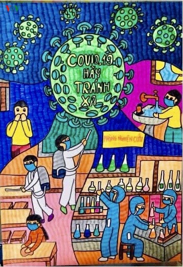 ບັນດາພາບແຕ້ມຂອງບັນດານ້ອງນ້ອຍເຍົາວະຊົນໂຮງຮຽນມັດທະຍົມຕອນຕົ້ນ ດ່ວານທິດ໋ຽມ ໄດ້ປະກອບສ່ວນຮ່ວມແຮງຮ່ວມໃຈຍູ້ໂລກລະບາດໂຄວິດ-19 ໃຫ້ຖອຍໄປ.