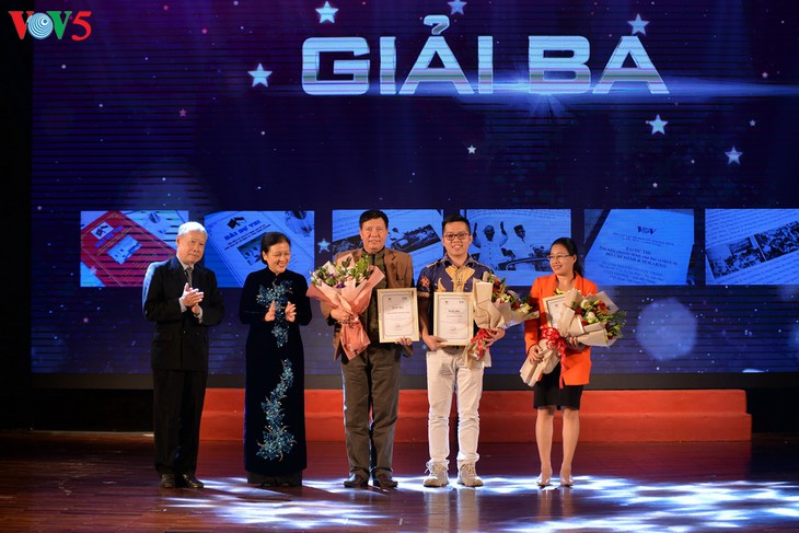 | ທ່ານ ຕ້າກວາງດົງ, ຮອງລັດຖະມົນຕີກະຊວງວັດທະນະທຳ, ກິລາ ແລະ ທ່ອງທ່ຽວ ແລະ ທ່ານ ເຈິ່ນມິງຮຸ່ງ, ຮອງຜູ້ອຳນວຍການໃຫຍ່ VOV ມອບລາງວັນທີ 2 ໃຫ້ທ່ານ ດິງດັງມິງ. |
