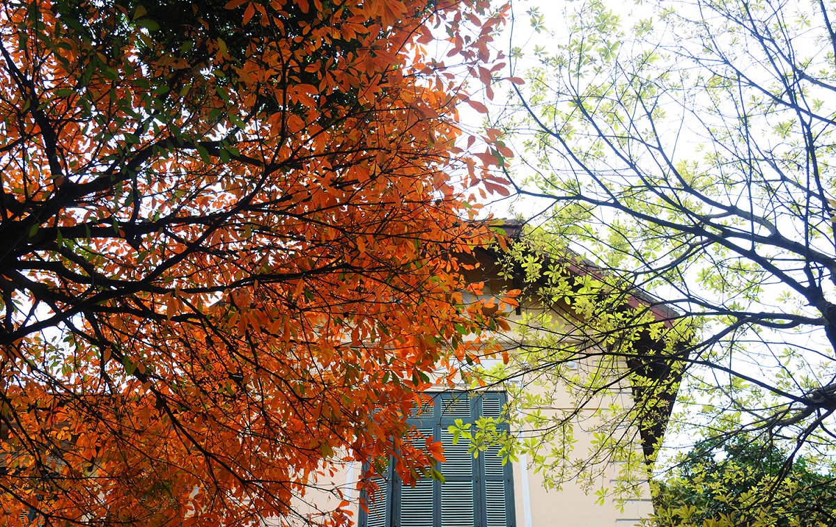 | ໃບໄມ້ໄດ້ປ່ຽນສູ່ສີແດງໃນທ່າມກາງອາກາດເຢັນສະບາຍຍາມ ລະດູໃບໄມ້ຫຼົ່ນ. ລະດູໃບໄມ້ຫຼົ່ນຍັງຝັງເລິກໃນຄວາມຊົງຈຳຂອງຫຼາຍຄົນດ້ວຍຮູບພາບບັນດາເສັ້ນທາງທີ່ເຕັມໄປດ້ວຍໃບໄມ້ສີເຫຼືອງຫຼົ່ນ. ເມື່ອຍ່າງເລາະຕາມຖະໜົນ ຟານດີງຟຸ່ງ, ເຈີນຟູ້, ໂງກວຽນ, ຮວ່າງຢ້ຽວ ກໍສາມາດຮູ້ສຶກໄດ້ເຖິງ ລະດູໃບໄມ້ຫຼົ່ນວຽນມາສູ່ຖະໜົນແຕ່ລະສາຍ. |
