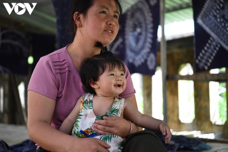| ແມ່ຍິງຄົນໜຶ່ງຊາວເຜົ່າມົ້ງພວມແນະນຳໃຫ້ແຂກຮູ້ກ່ຽວກັບບັນດາຊຸດອາພອນທີ່ມີລາຄານັບລ້ານດົ່ງ |