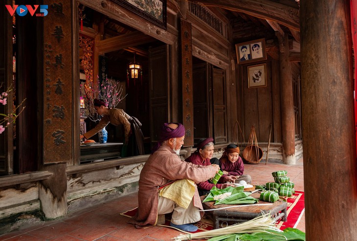 | ບັນດາສະມາຊິກໃນຄອບຄົວຈາກເດັກນ້ອຍຫາຜູ້ເຖົ້າຜູ້ແກ່ກໍ່ໄດ້ເຕົ້າໂຮມກັນນັ່ງຫໍ່ເຂົ້າຕົ້ມ. |