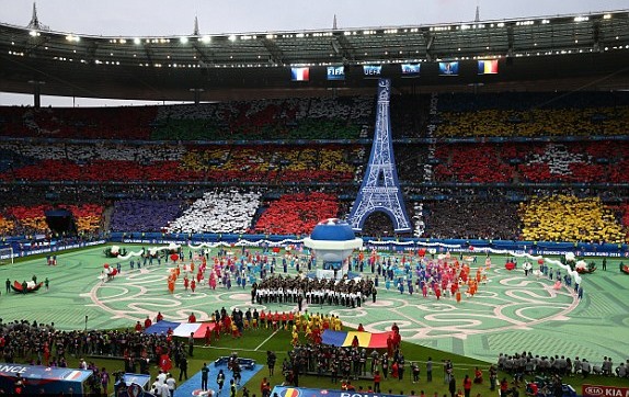 ຕອນເຊົ້າວັນທີ 11/6 (ຕາມເວລາຮ່າໂນ້ຍ), ພິທີເປີດງານແຂ່ງຂັນຊິງຊະນະເລີດບານເຕະ ເອີລົບ EURO 2016 ໄດ້ຈັດຂຶ້ນໃນສະໜາມກິລາ Stade de France ຢູ່ນະຄອນ Saint – Denis, ທາງພາກເໜືອນະຄອນຫຼວງ ປາຣີ, ປະເທດ ຝຣັ່ງ. ພິທີໄດ້ຈັດຕັ້ງໃນປະມານ 15 ນາທີ ດ້ວຍບັນດາລາຍການຟົດຟື້ນມ່ວນຊື່ນ, ເຕັ້ມໄປດ້ວຍສີສັນຂອງນັກອາສາສະໝັກນັບຮ້ອຍຄົນທີ່ມາຈາກກ່ວາ 60 ປະເທດ. ທ່ານປະທານາທິບໍດີ Francois Hollande ພ້ອມກັບເຈົ້າໜ້າທີ່ປະເທດເຈົ້າພາບຫຼາຍທ່ານໄດ້ເຂົ້າຮ່ວມພິທີ.