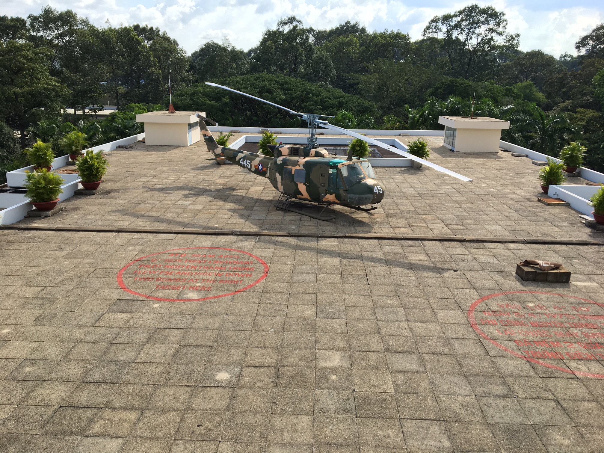 ທຳນຽບເອກະລາດໄດ້ຮັບການກໍ່ສ້າງໃນເນື້ອທີ່ 4.5000 m2, ເນື້ອທີ່ນຳໃຊ້ 20.000 m2, ລວມມີ 3 ຊັ້ນ. ປະຈຸບັນຍັງມີເອລີກອບຄັນໜຶ່ງທີ່ມີໝາຍເລກ UH1 ນີ້ແມ່ນເຮືອບິນສູ້ຮົບ ໂດຍບໍລິສັດ Bell (ອາເມລິກາ) ຜະລິດ, ປະກອບໃຫ້ ອາເມລິກາ ປີ 1959 ເພື່ອນຳໃຊ້ໃນ ສົງ ຄາມ ຫວຽດນາມ ປີ 1962.