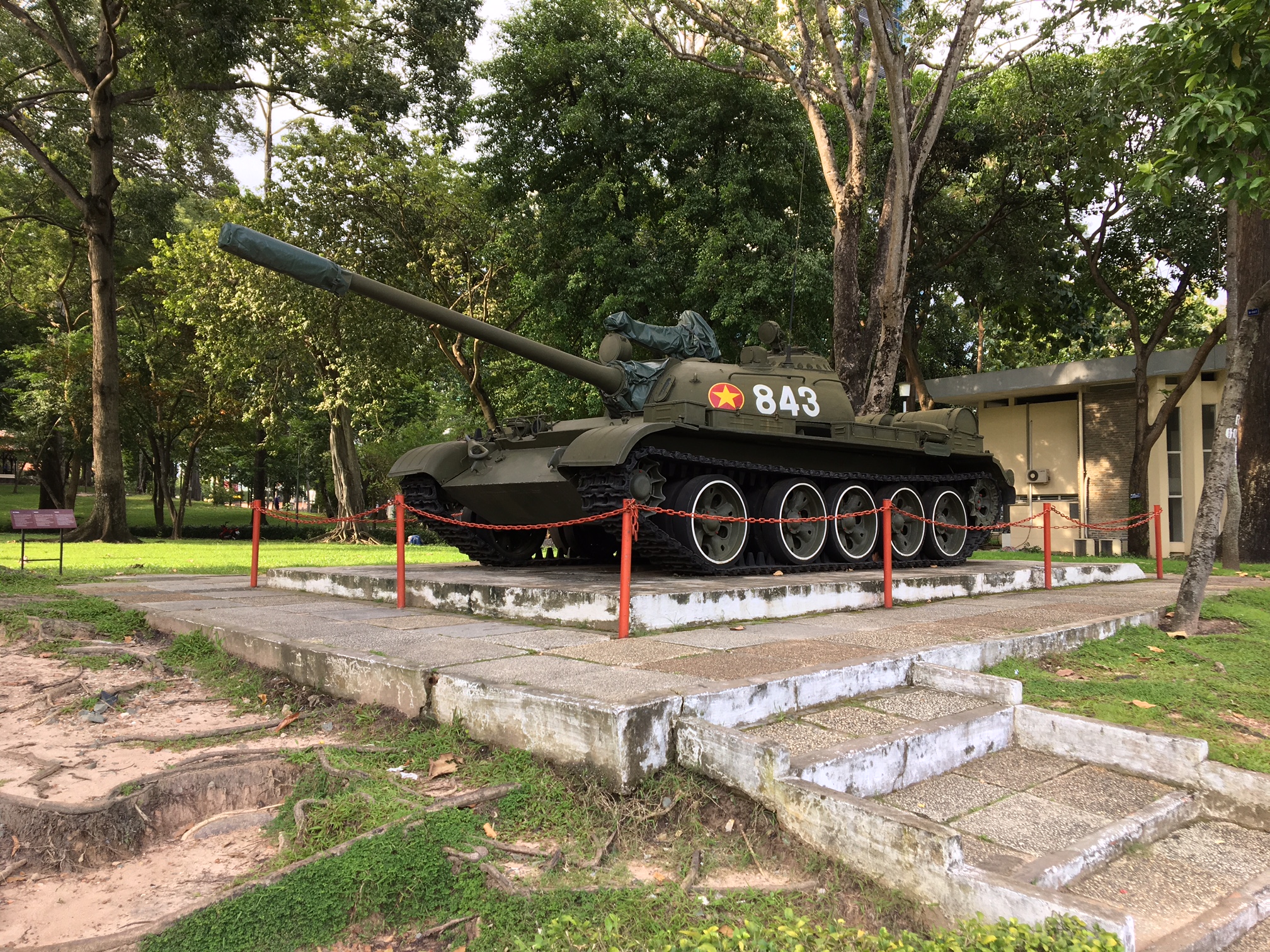 ທີ່ເດີນທຳນຽບເອກະລາດໄດ້ວາງສະແດງລົດຖັງ 2 ຄັນ, ທີ່ໜຶ່ງແມ່ນລົດຖັງມີໝາຍເລກ 843 ຂອງທະຫານປົກປ່ອຍຂຶ້ນກັບກອງຮ້ອຍ 4, ກອງພັນນ້ອຍທີ 1, ກອງພົນນ້ອຍລົດຖັງ 203, ກອງພົນໃຫຍ່ 2 ນຳໜ້າຮູບແຖວໄດ້ຕຳໃສ່ປະຕູສຳຮອງຂອງທຳນຽບເອກະລາດໃນເວລາ 10 ໂມງ 45 ນາທີວັນທີ 30/04/1975.