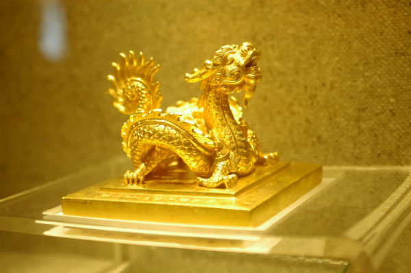 ![]() ກາຈຳ້ ເຊິ່ງເຈົ້າຊີວິດ ມິງເມ້ັງ ໃຫ້ຫຼໍ່ ເມື່ອປີ 1827. ນີ້ແມ່ນວັດຖຸພັນທີ່ເປັນສັນຍາລັກໃຫ້ສິດອຳນາດຂອງສະໄໝລາຊະວົງ ຫງວຽນ. |