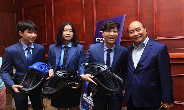 ທ່ານປະທານປະເທດ ຫວຽດນາມ ຫງວຽນຊວັນຟຸກ ພ້ອມດ້ວຍກຸ່ມເພື່ອນໜຸ່ມທີ່ປະດິດແຕ່ງໝວກກັນໂຄວິດແບບເຄື່ອນທີ່ Vihelm