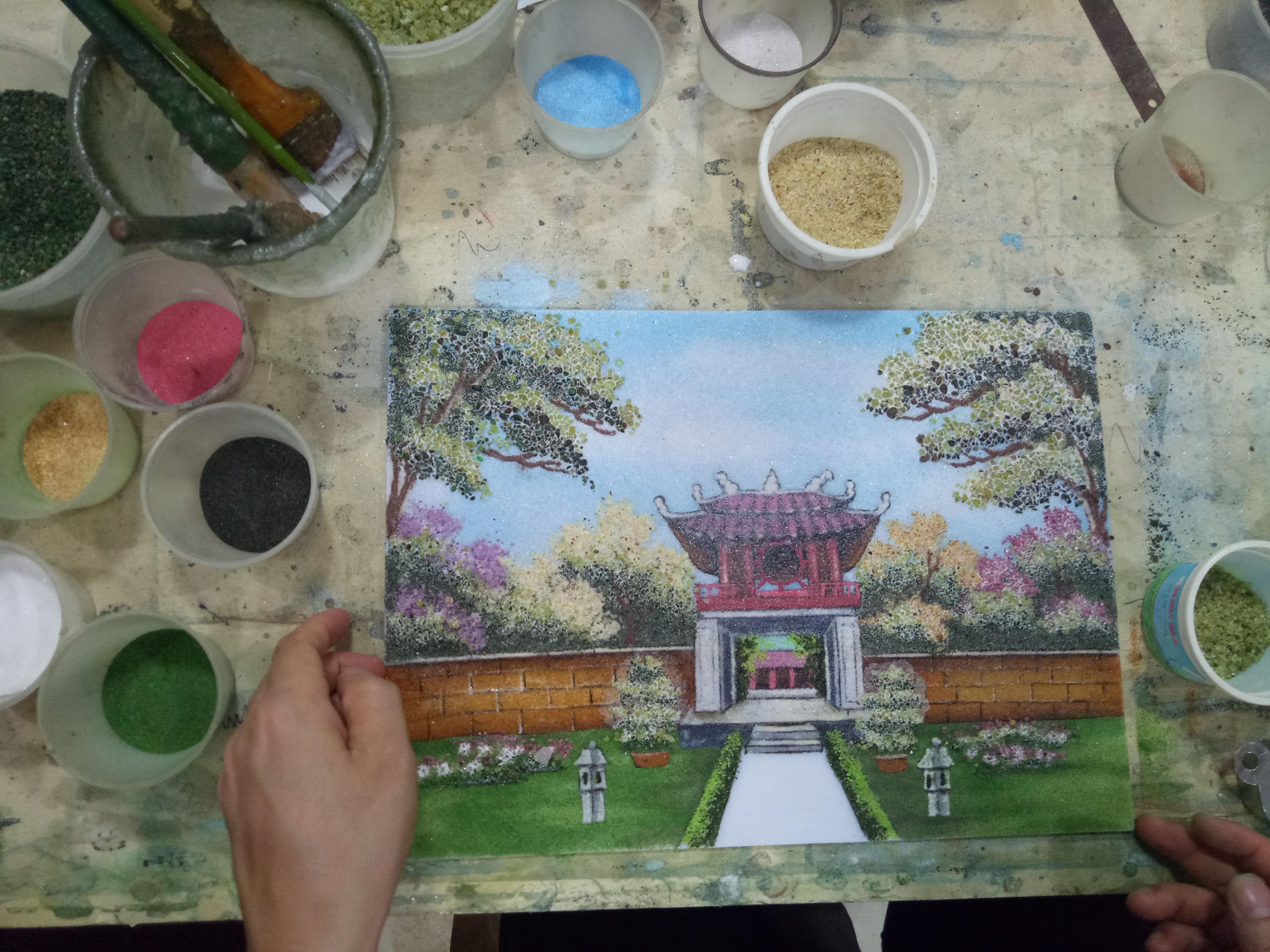 ໂຮງງານມີເນື້ອທີ່ປະມານ 100 ຕາແມັດ, ຢູ່ລຽບຕາມຕີນຝາເບື້ອງຂວາແມ່ນຕູ້ບັນຈຸຫີນຫຼາກຫຼາຍສີຄື: ຫີນ Ruby, Saphia, Opal ຫຼື ຫີນຄວາດເຫຼືອງ…ດ້ວຍຂະໜາດທີ່ແຕກຕ່າງກັນ. ບັນດານັກສິລະປະການຂອງບໍລິສັດ ຊວນຫວຽດ ພວມໝົກມຸ່ນ, ເມົາມົວປະກອບຫີນເສດເຫຼືອແຕ່ລະເມັດ, ແຕ່ລະປ່ຽງຕິດໃສ່ພາບ. ມີຜູ້ຊາຍຄົນໜຶ່ງ ອາຍຸກ່ວາ 30 ປີ, ເປັນຄົນຮ່າງນ້ອຍ ແລະ ຜິວຄ້ຳ, ພວມແຕ້ມຮູບພາບ ວັນມ໊ຽວກວັກຕື້ຢ໊າມ (ເຊິ່ງເປັນມະຫາວິທະຍາໄລແຫ່ງທຳອິດຂອງ ຫວຽດນາມ) ໃສ່ພື້ນ focmica ສີຂາວ ແລະ ກະກຽມຂັ້ນຕອນຕິດຫີນໃສ່. ລາວຊື່ວ່າ ຫວໍດິ່ງນາມ, ບ້ານເກີດຢູ່ ກວາງນາມ ໄດ້ປະກອບອາຊີບນີ້ມາເປັນເວລາ 10 ປີແລ້ວ. ລາວທັງໂຮຍຝຸ່ນຫີນໃສ່ຮູບ, ທັງແບ່ງປັນກ່ຽວກັບຂັ້ນຕອນການເຮັດຮູບດ້ວຍຫີນປະເສີດທີ່ວ່າ: