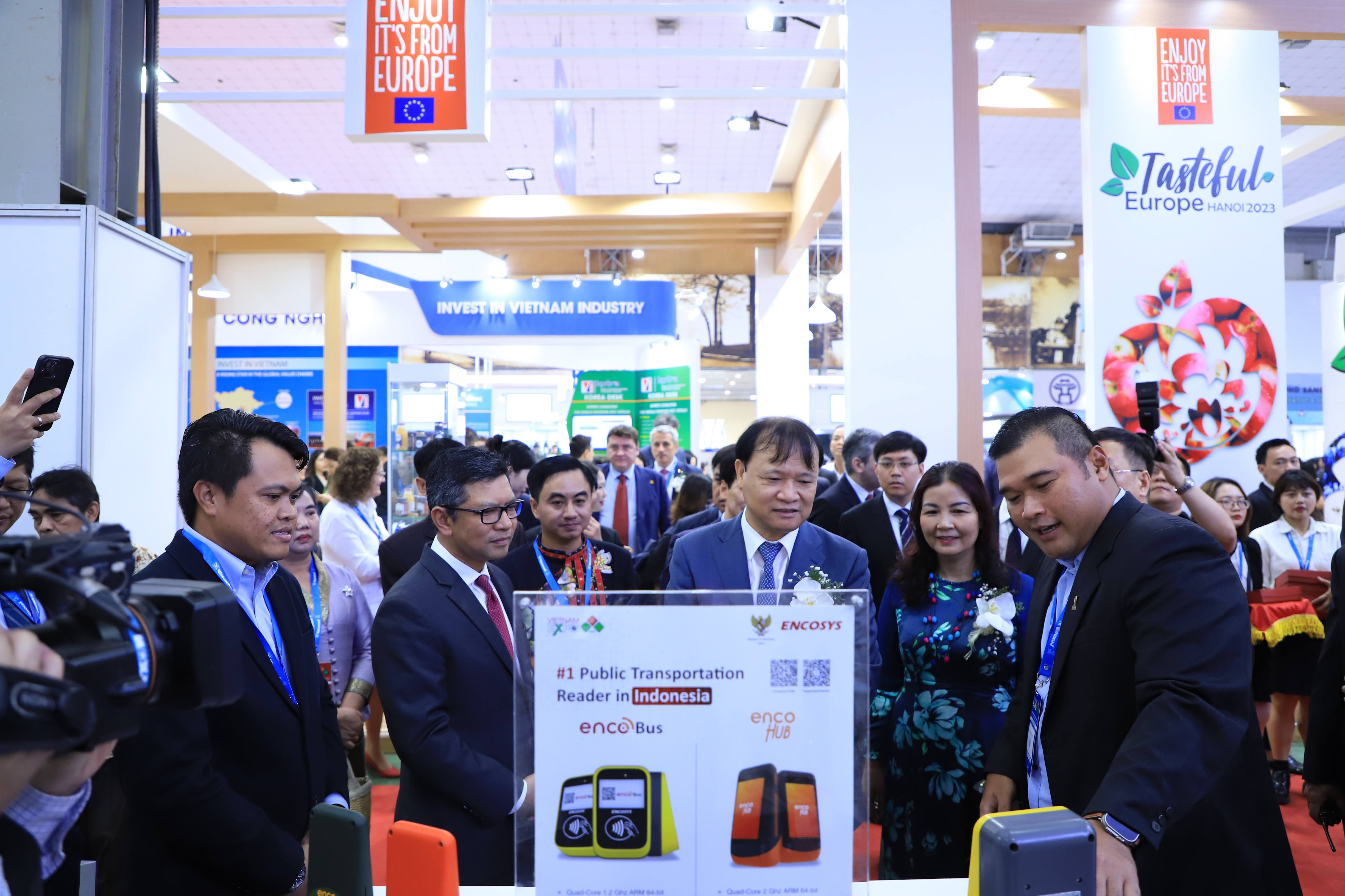 ດ້ວຍຫົວຂໍ້ “ຮ່ວມເດີນທາງພ້ອມກັບວິສາຫະກິດໃນສັງກະລາດດີຈີຕອນ” VIETNAM EXPO 2023 ໄດ້ດຶງດູດການເຂົ້າຮ່ວມຂອງວິສາຫະກິດ 500 ແຫ່ງ, ມີຮ້ານວາງສະແດງ 600 ຮ້ານ ທີ່ມາຈາກ 15 ປະເທດ ແລະ ເຂດແຄ້ວນ, ວາງສະແດງບັນດາກຸ່ມຂະແໜງສິນຄ້າຫຼາຍຮູບແບບ ແລະ ເປັນເອກະລັກສະເພາະ. ເຂດວາງສະແດງສິນຄ້າສາກົນໄດ້ດຶງດູດການເຂົ້າຮ່ວມວິສາຫະກິດມາຈາກປະເທດຕ່າງໆຄື: ສ ເກົາຫຼີ, ຈີນ, ໂປໂລຍ, ອິນໂດເນເຊຍ, ມຽນມາ, ລາວ, ກຸຍບາ… ໃນນັ້ນ, ບັນດາຜະລິດຕະພັນທີ່ ອິນໂດເນເຊຍ ນຳມາແນະນຳທີ່ງານຕະຫຼາດນັດຄັ້ງນີ້ລວມມີ: ເຕັກໂນໂລຊີລະບົບຄວບຄຸມ, ຊຳລະໃນການຂົນສົ່ງ, ເສື່ອ, ເຄື່ອງດື່ມ, ສະບຽງອາຫານ.