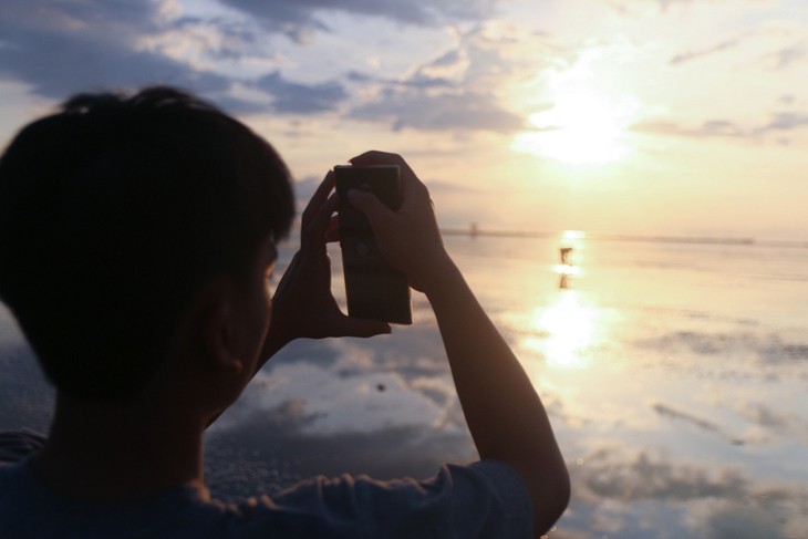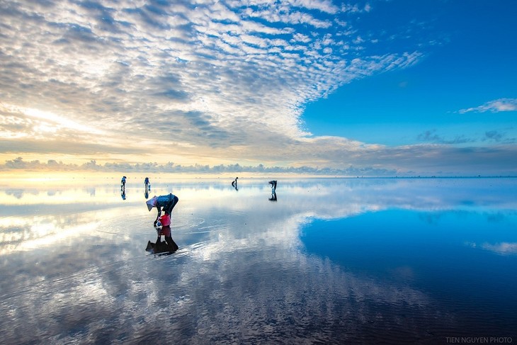 Quang Lang has quite different natural features compared to other beaches. During low tide, the water is just ankle deep. The sea looks like a vast mirror reflecting the beautiful sky. (Photo: Tien Nguyen) |