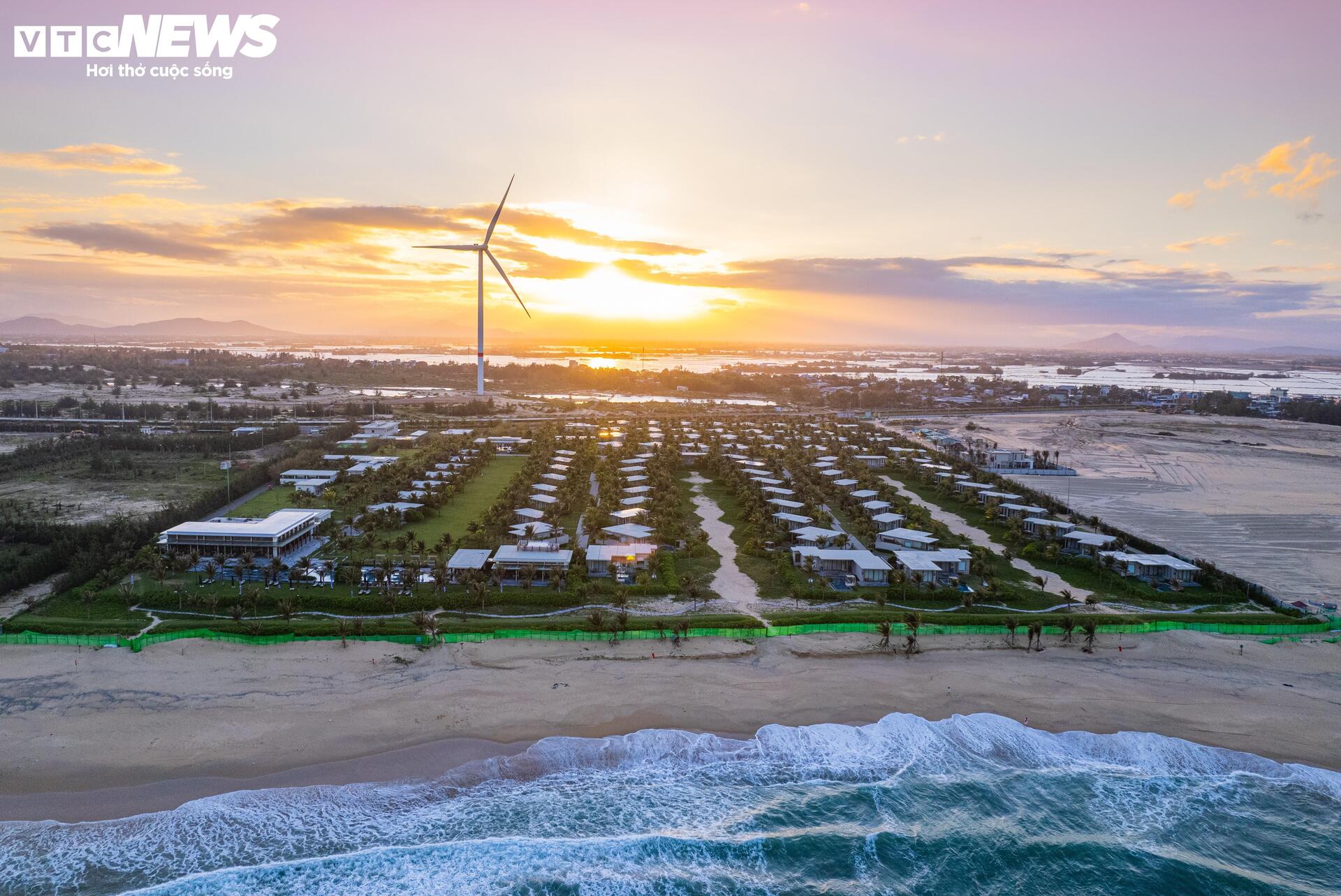 On Phuong Mai Peninsula, within the Nhon Hoi Economic Zone, wind turbines rotate steadily against a backdrop of blue sky, white sand, and crashing waves—a visual contrast of modern energy and raw coastal wilderness. |