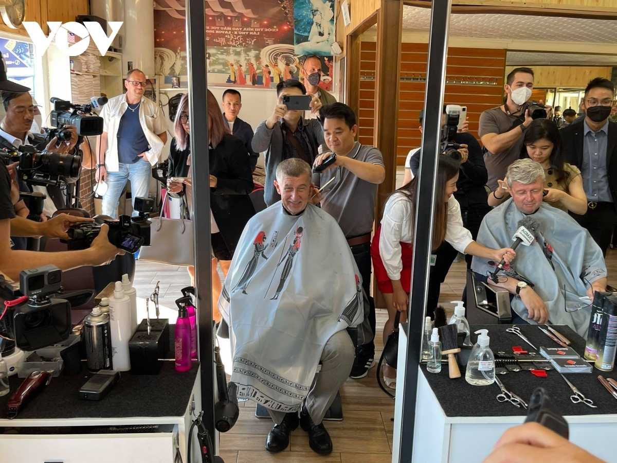 The Czech government leader and other officials are excited to have their hair cut at the trading centre.