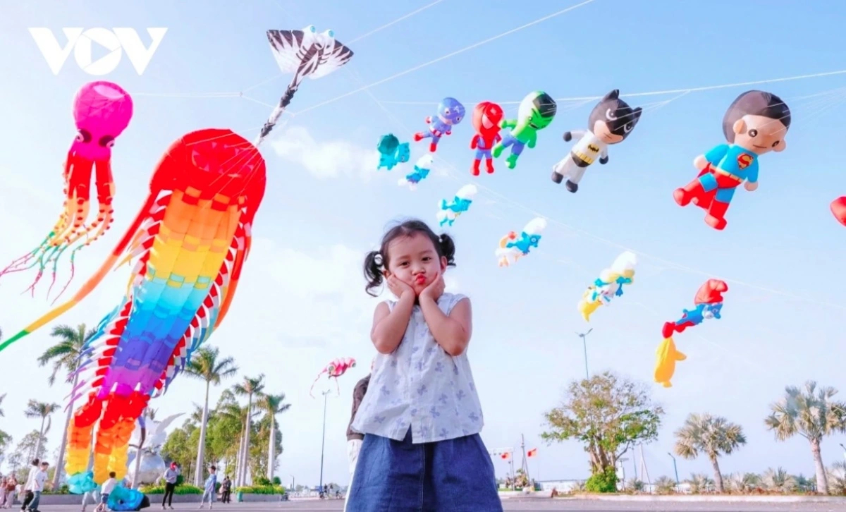Children enjoy watching kites flying high over Can Tho city and posing for nice photos. |