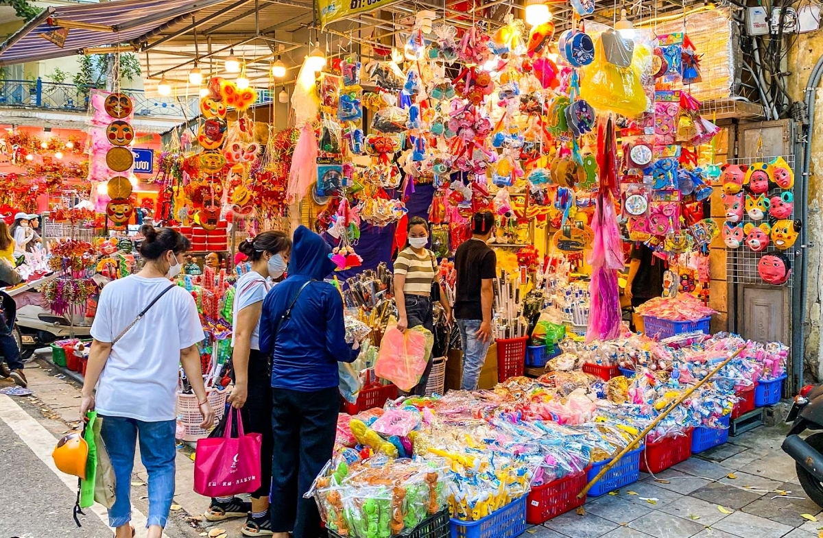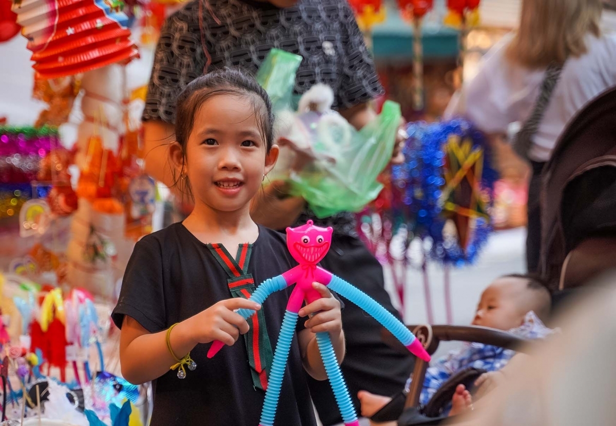 Mid-Autumn decorations, especially traditional and modern toys for children, are put on display. |