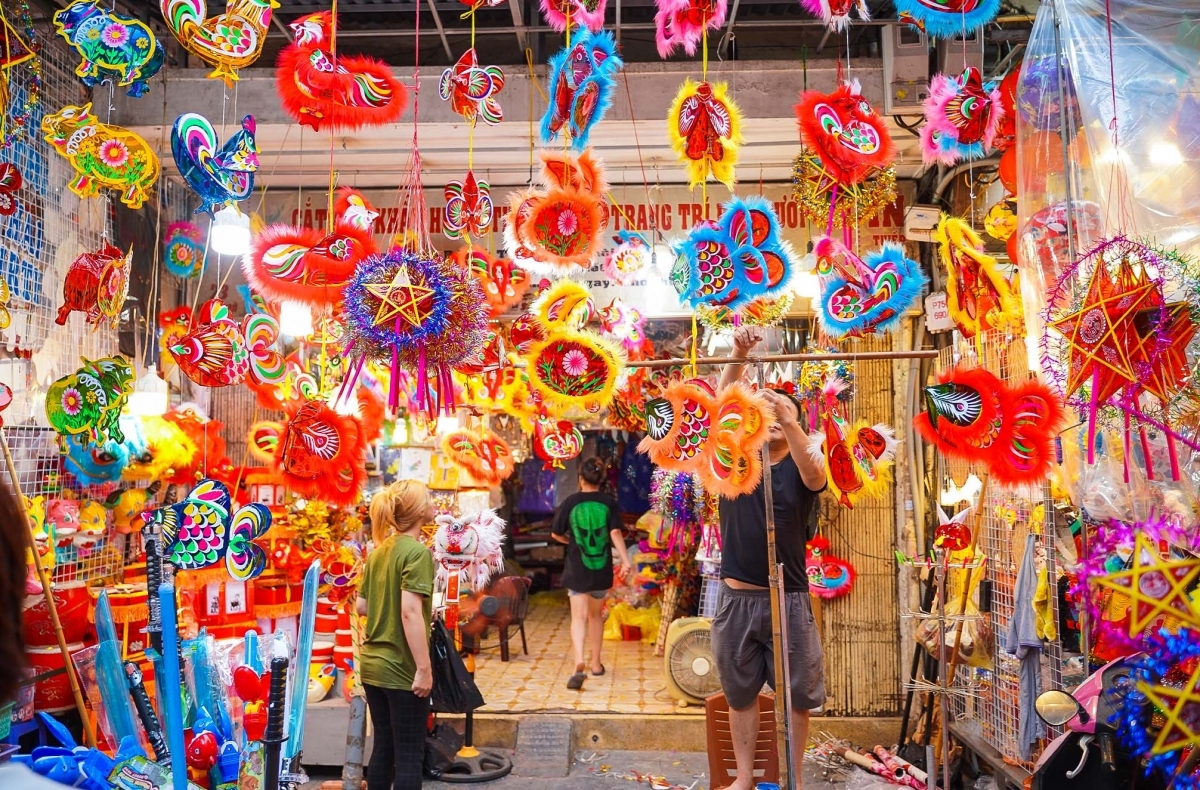 Every Mid-Autumn festival the street lights up with the brilliant colours of lanterns, star lanterns, and a myriad of eye-catching decorative items. |