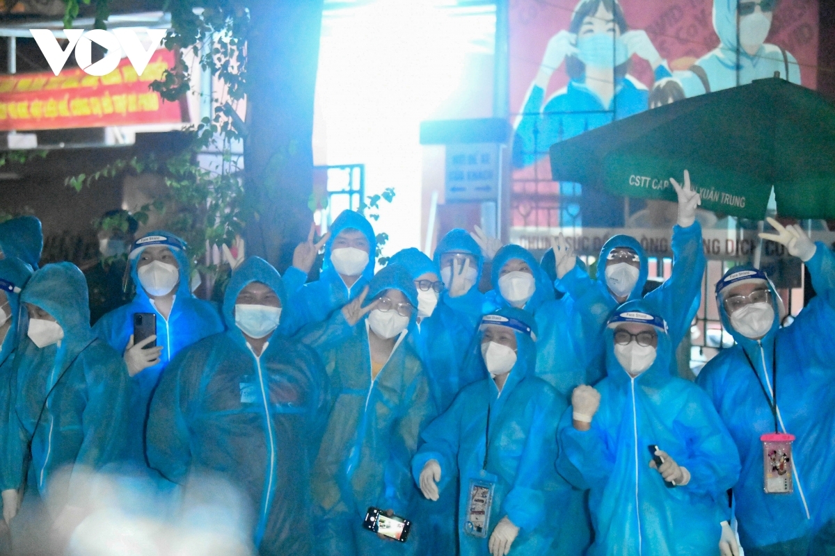 Volunteers share their happiness among each other following the removal of lockdown in Thanh Xuan Trung ward’s COVID-19 hotspot. |