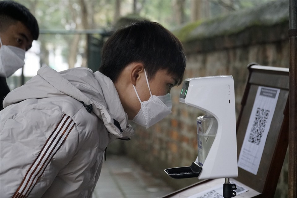 ![]() Visitors are required to have their body temperature taken and use hand sanitizer before entering the Temple of Literature. |