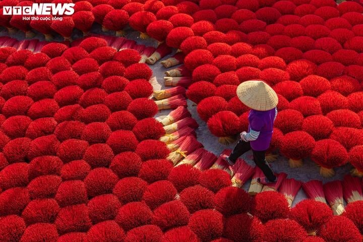 To attract tourists, many households arrange the incense stick bundles into shapes like the red flag with a yellow star, the national flag of Vietnam. |