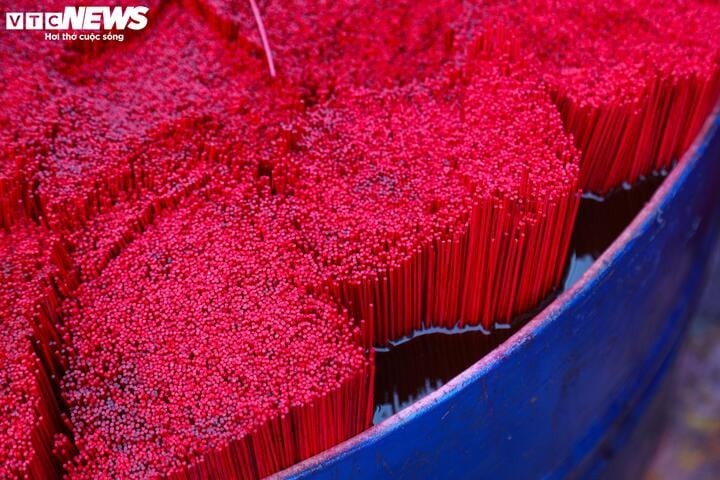 Incense sticks at Quang Phu Cau village are usually dyed pink or red, depending on customer orders. Red-dyed incense is typically used in temples, while pink-dyed incense is used in homes. |