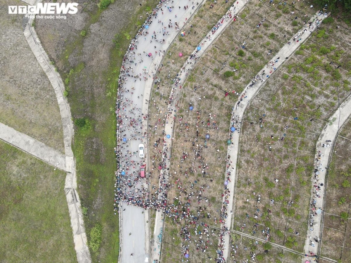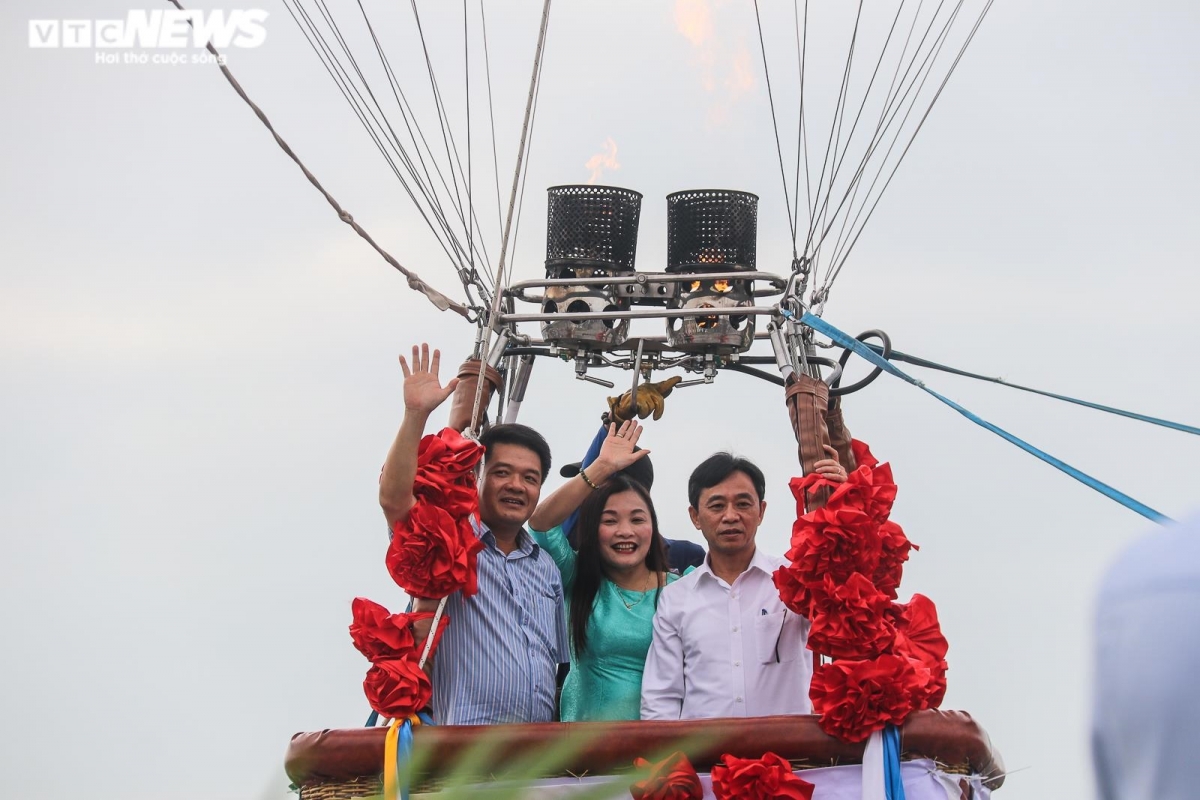 Crowds of people eagerly flock to the main dam of Ngan Trui irrigation lake to witness the hot air balloons taking to the skies with their own eyes. |