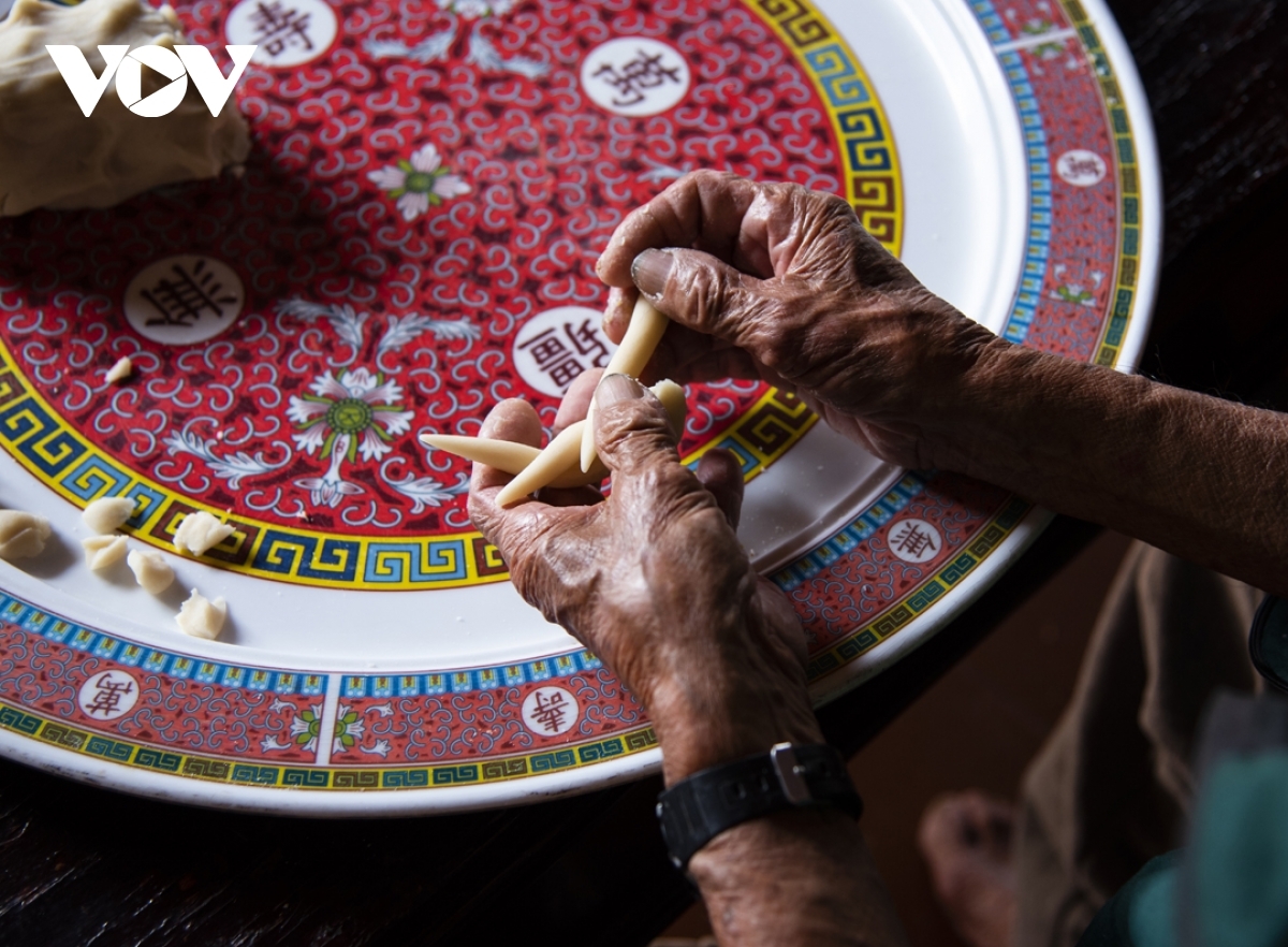 | Many households in An Thanh village prepare 10 kinds of different cakes especially for Tet celebrations. However, only Lang is able to produce unique ginseng and pineapple cakes. |
