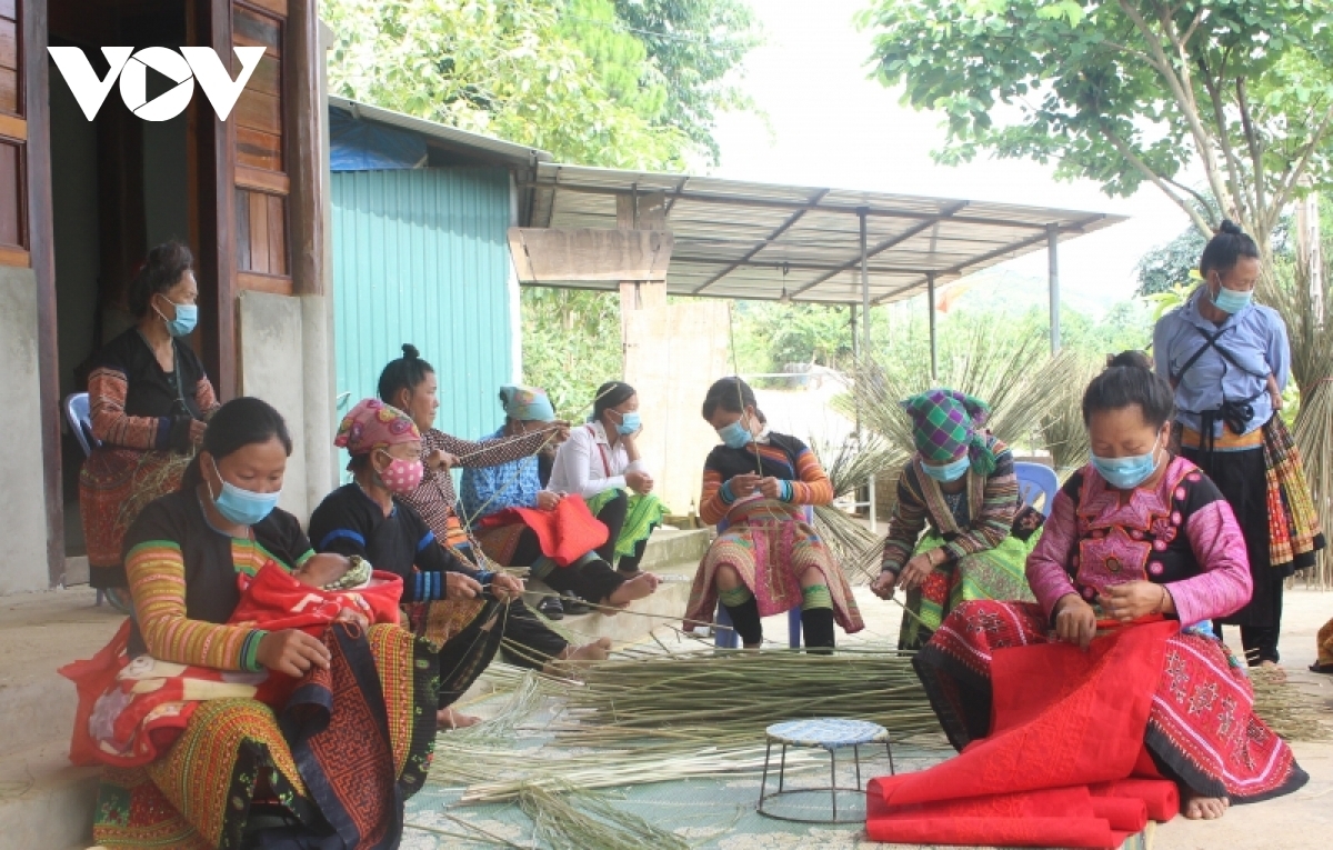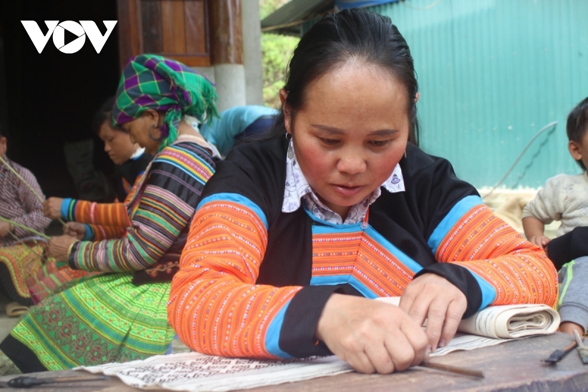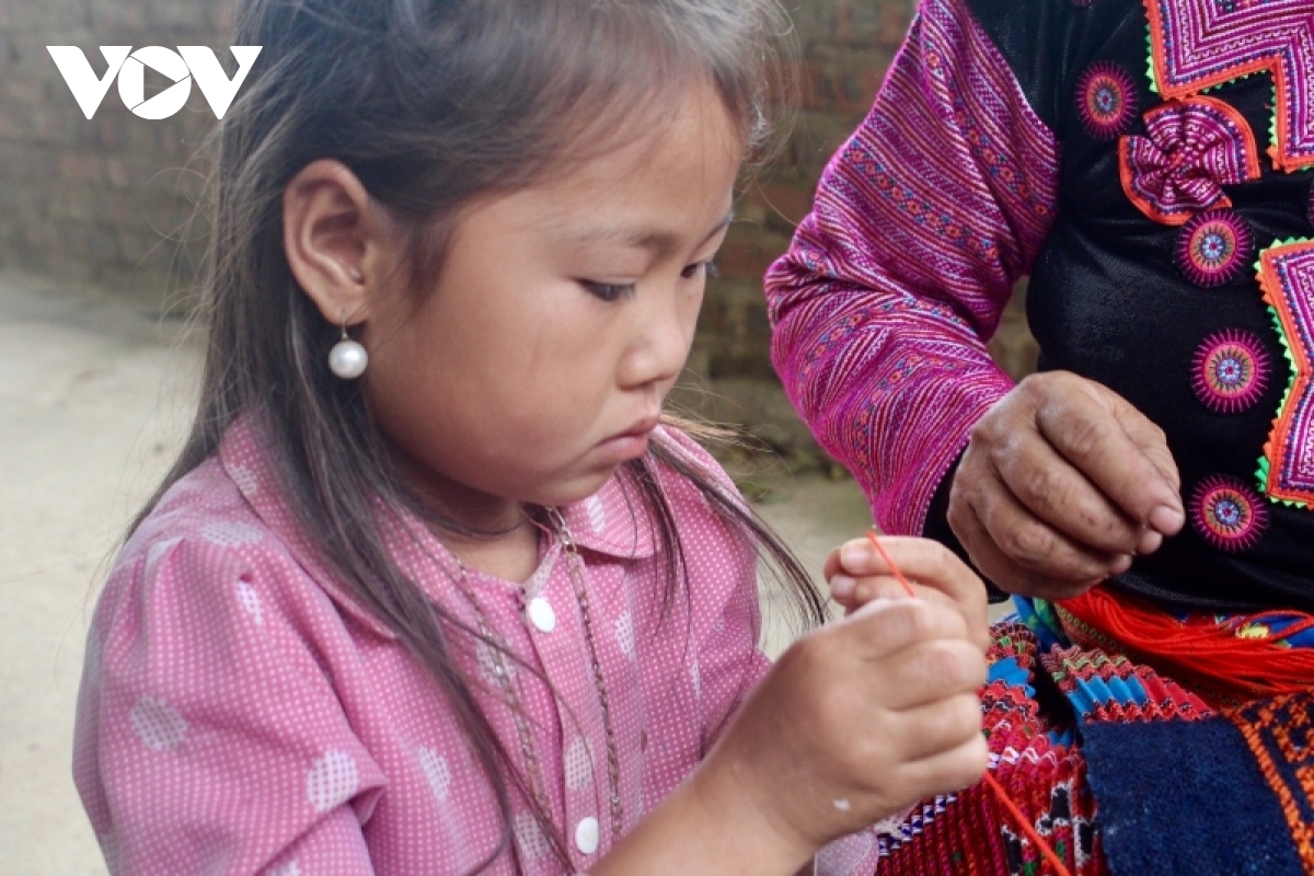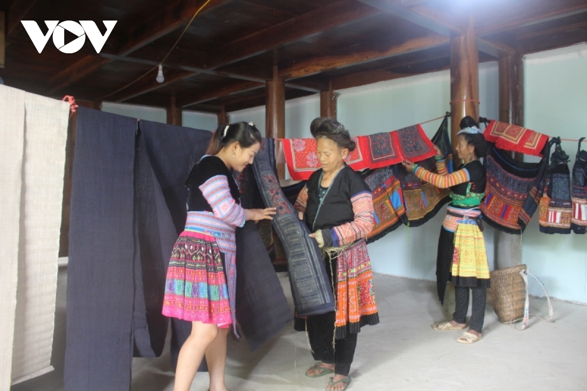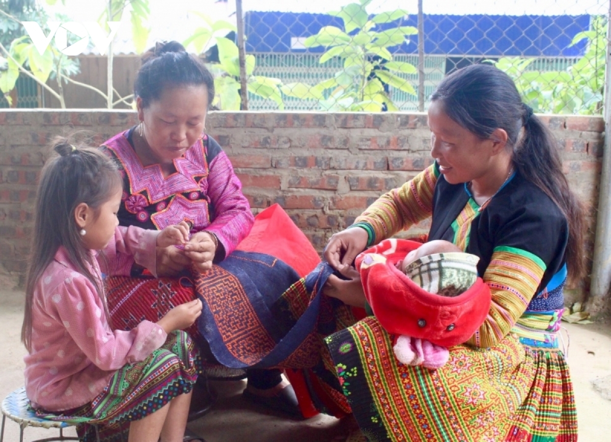 ![]() Traditional decorative patterns of the Mong people can be seen on their linen sheets. |