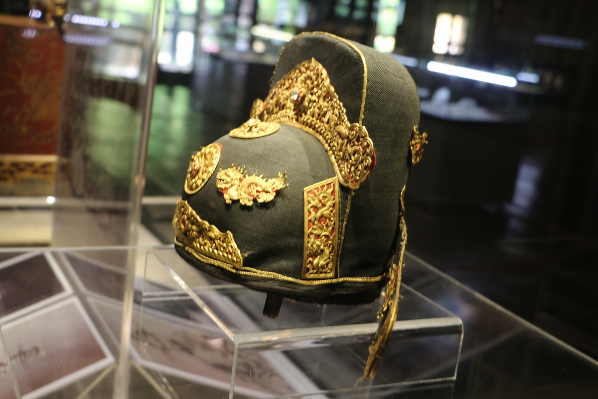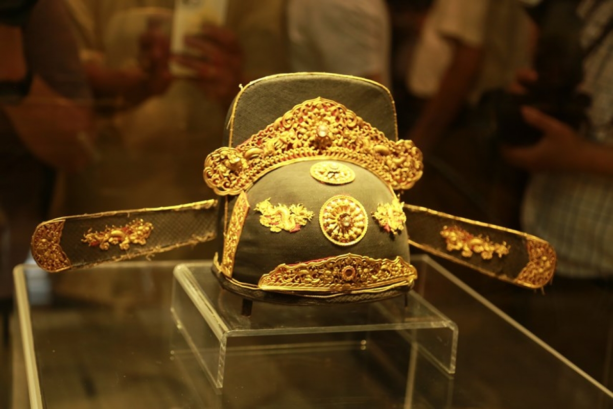 The two artifacts - a mandarin hat and a dress - had been put up for public auction in Spain and won by Vietnam's Sunshine Group. The economic group has then decided to donate the royal items to the Hue Monuments Conservation Centre. In the photo is the Nguyen Dynasty mandarin hat on display at the museum. |