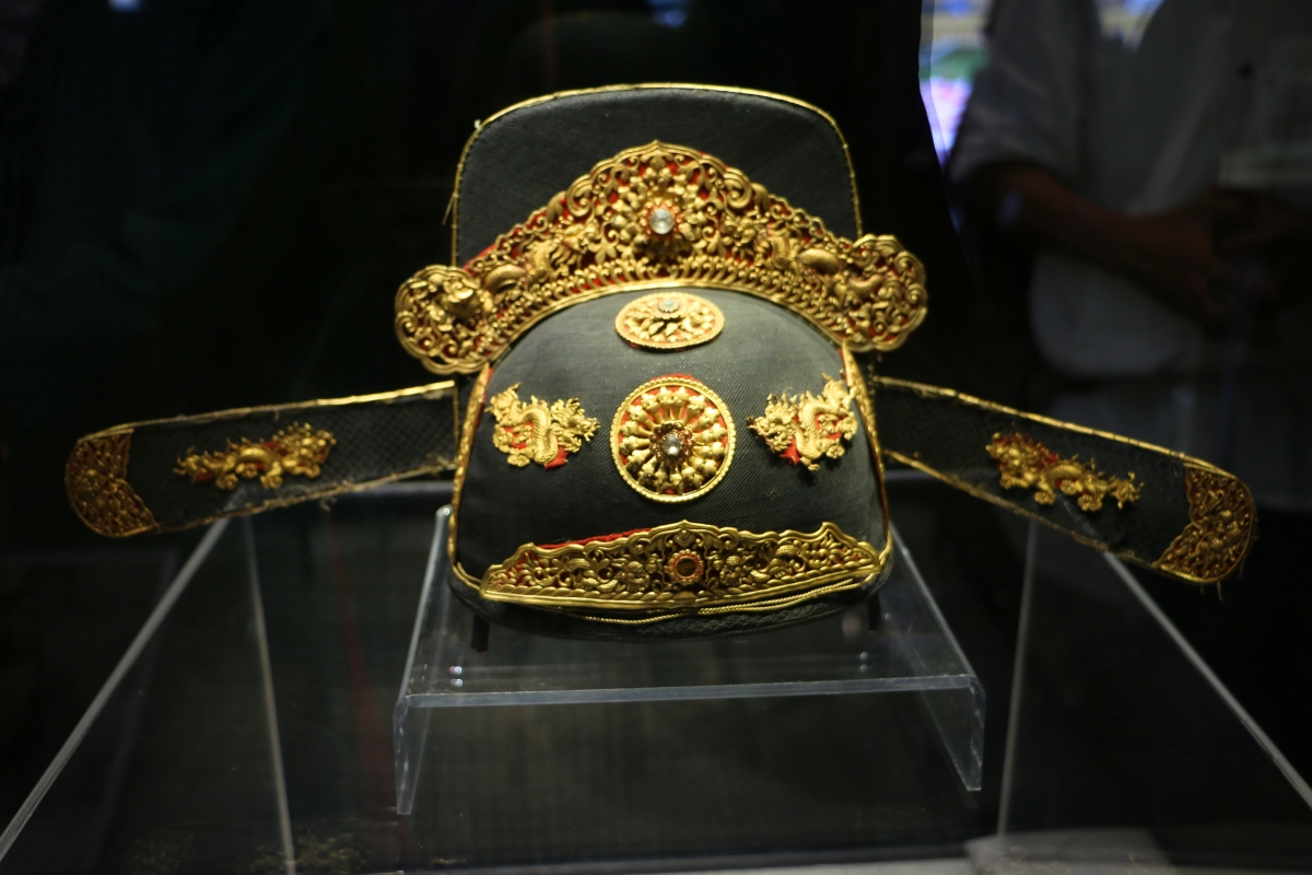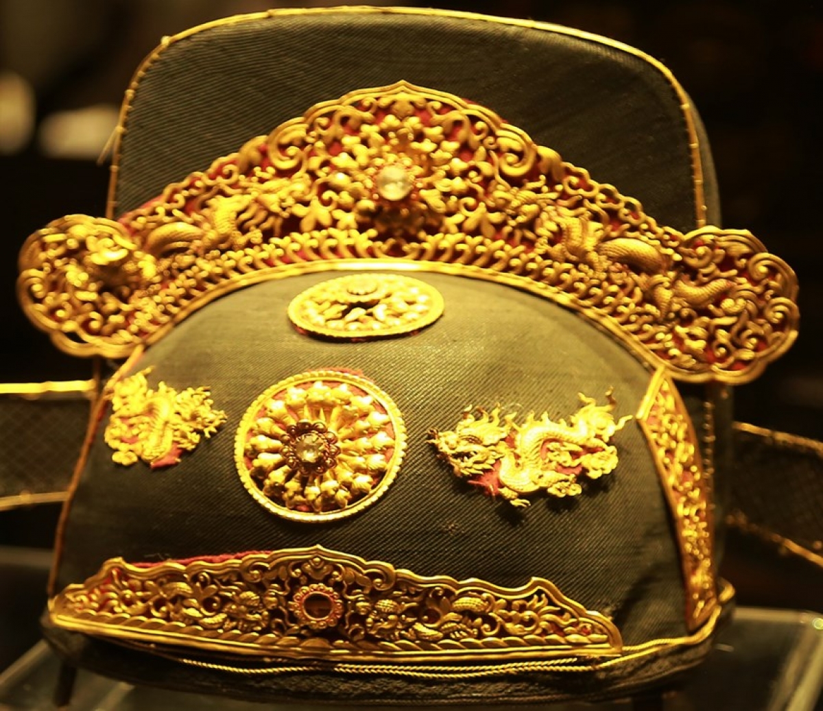 A box made of lacquered and gilded wood contains a Nguyen Dynasty mandarin hat. |